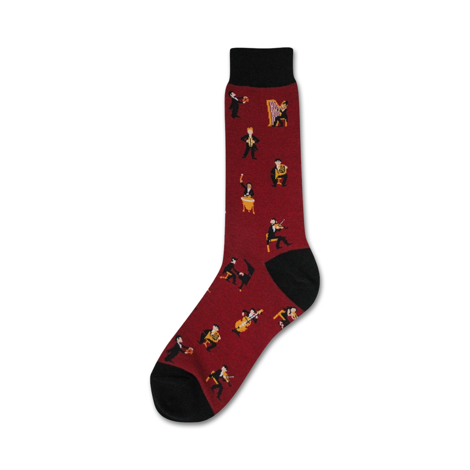 Put some pep in your step with our Symphony socks! These red, crew-length socks are covered in cartoonish musicians playing their hearts out on various instruments. Perfect for the music lover in your life, these socks will have you toe-tapping and head-bopping all day long. Plus, they're guaranteed to put a smile on anyone's face you meet.
