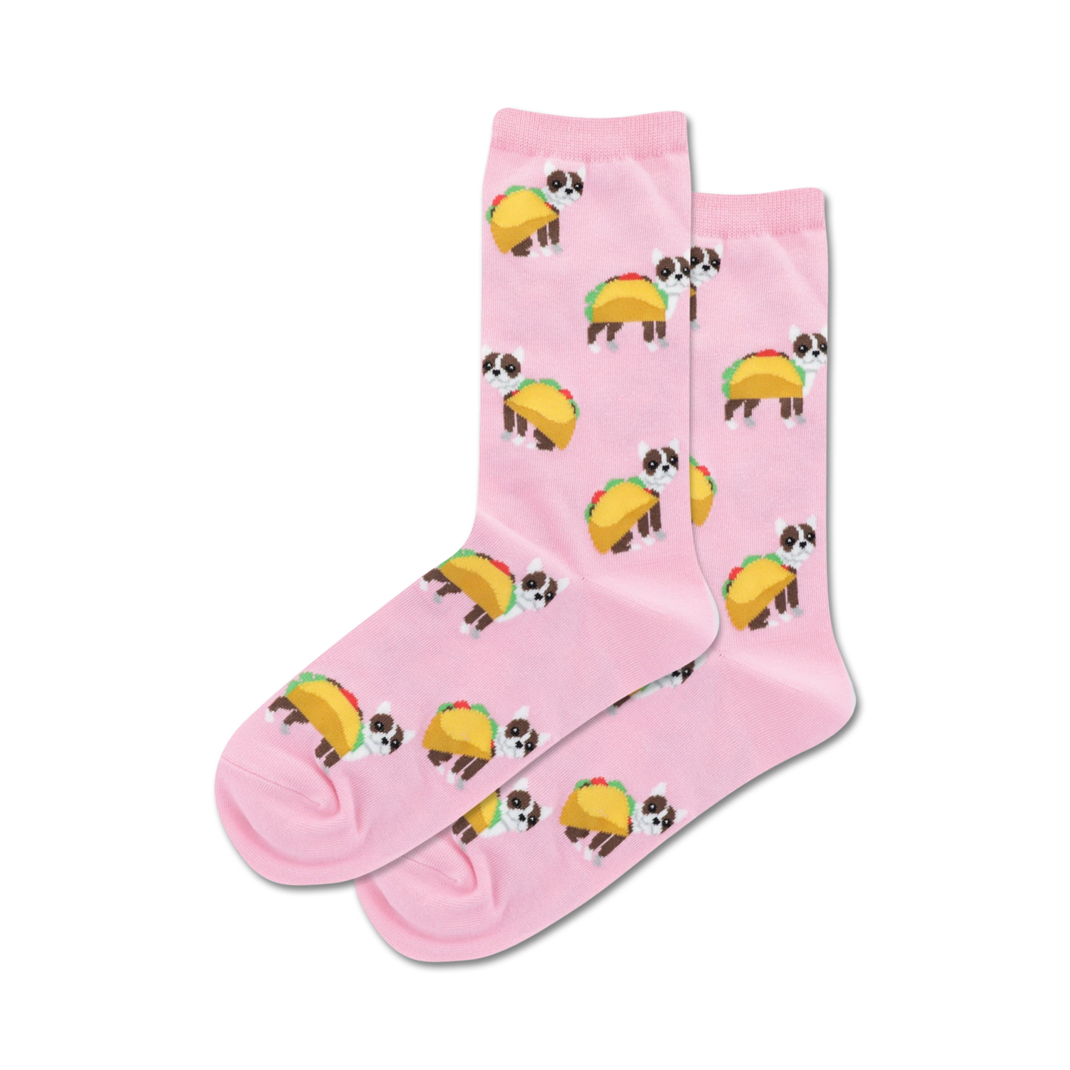 Taco Terrier socks: The pawfect accessory for any dog lover! These crew length socks feature an allover pattern of cartoon tacos with terrier dogs wearing them like a costume. The black background of the socks makes the taco-wearing terriers really pop. A fun and playful way to show off your love for dogs and tacos, the Taco Terrier Socks are sure to put a smile on your face and the faces of those around you. Fun fact: Terriers are known for their feisty and energetic personalities, just like tacos are known for their spicy and flavorful fillings!