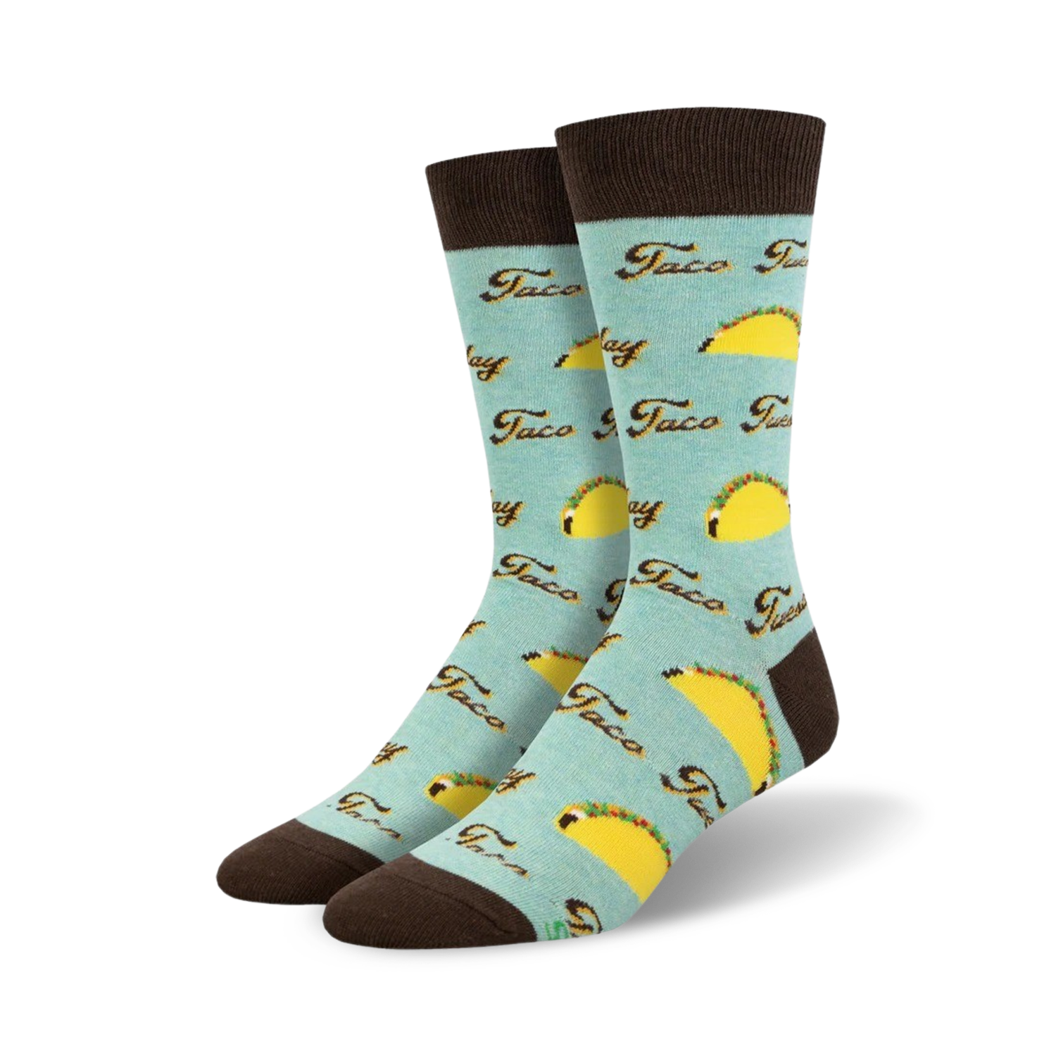 Spice up your sock game with our hilarious Taco Tuesday socks featuring a lively pattern of cheerful cartoon tacos. These blue crew socks for men are perfect for casual outings. Who says tacos are just for Tuesday? Live the fiesta every day!