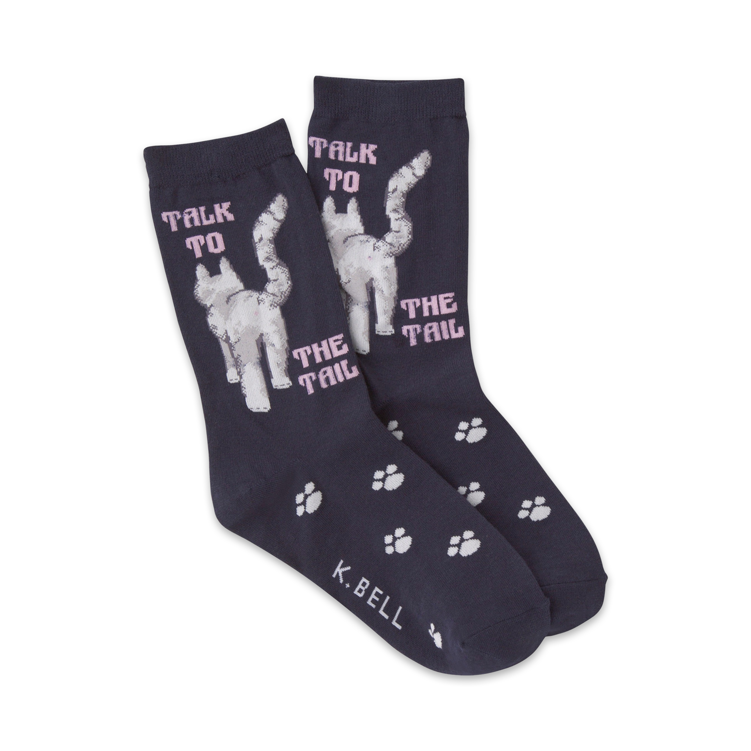 Sometimes people are just too much to deal with. Thank goodness for cats! These funny cat print black socks feature the back-end of a cat walking away with the phrase "Talk To The Tail". These awesome socks are purrfect for days you just want to be left alone. Leave us meow't of it!