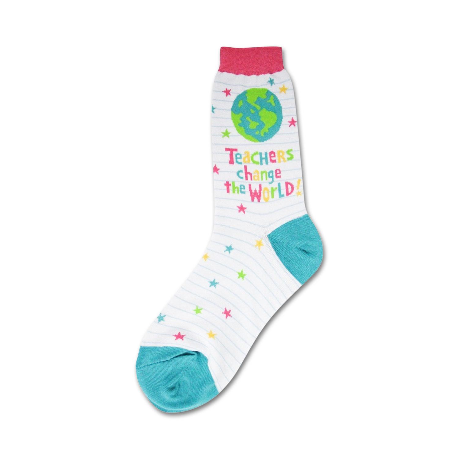 Teachers World socks are the perfect way to show your appreciation for the amazing educators in your life. These fun crew socks feature rainbow-colored letters that spell out "Teachers change the world!" against a white background with light blue stars. The light blue toes, heels and cuffs add a touch of playfulness, and the pink band above the cuff is the perfect finishing touch. Whether you're a teacher yourself or you just want to show your support for those who are, these socks are a great way to do it! Fun fact: Did you know that teachers are superheroes who deserve all the love and appreciation in the world?