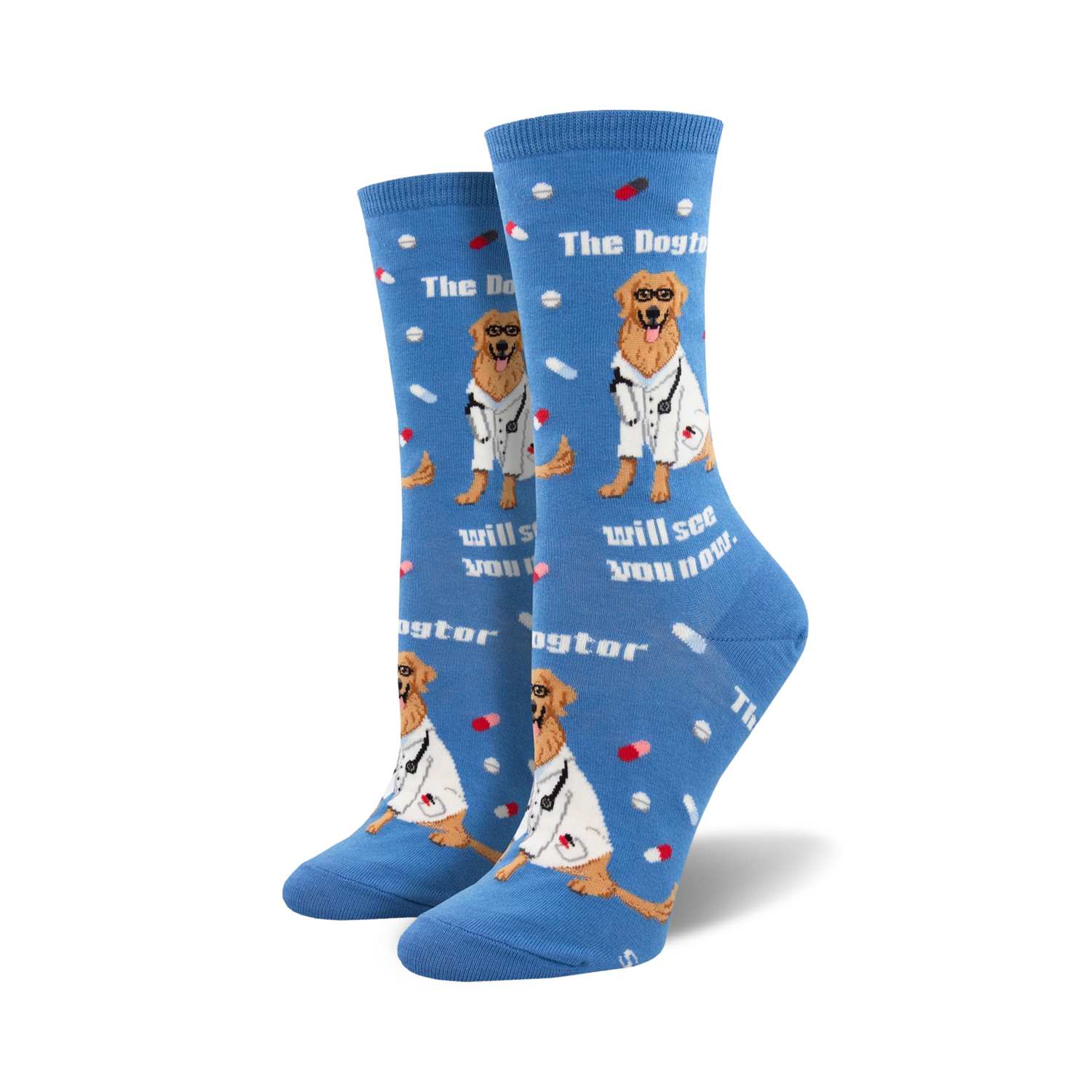 Woof! Calling all dog lovers! Put your paws in a pair of our Doc Socks and let the fun begin! These playful socks feature a crew of cartoon dogs decked out in white lab coats and stethoscopes, ready to give you a thorough checkup. With a sprinkle of red and white pills and the words "The Dogtor is In" and "Will See You Now," these socks are sure to bring a smile to your face and make you the life of the party. Get your paws on a pair today and let the good times roll!