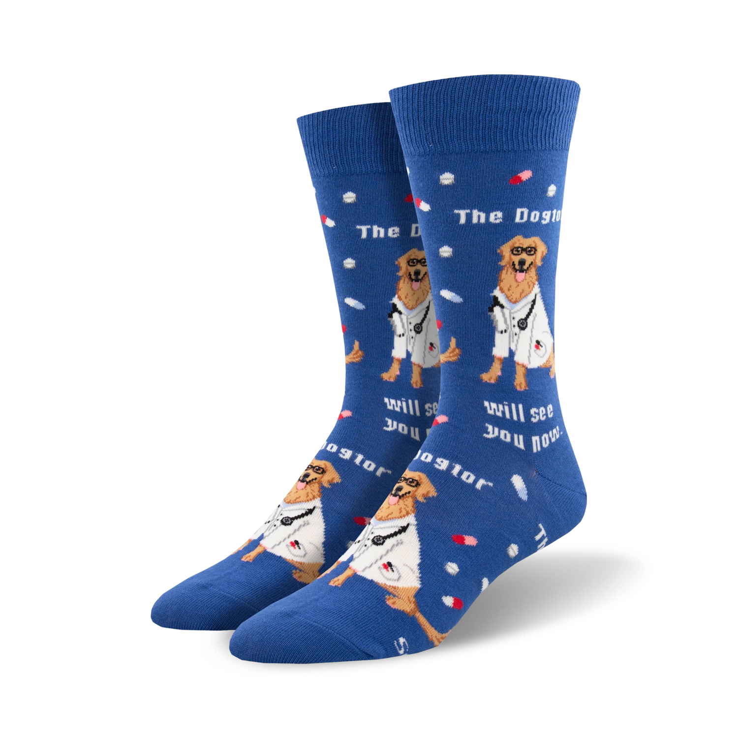 Show off your love for man's best friend with these paw-some Golden Retriever crew socks. Featuring a pattern of a Golden Retriever wearing a stethoscope and a white coat, these socks have the text "The Dogtor Will See You Now". Perfect for any dog lover, these socks will make you smile every time you see your tootsies. They're also the perfect gift for that special vet, dog groomer or dog mom in your life.