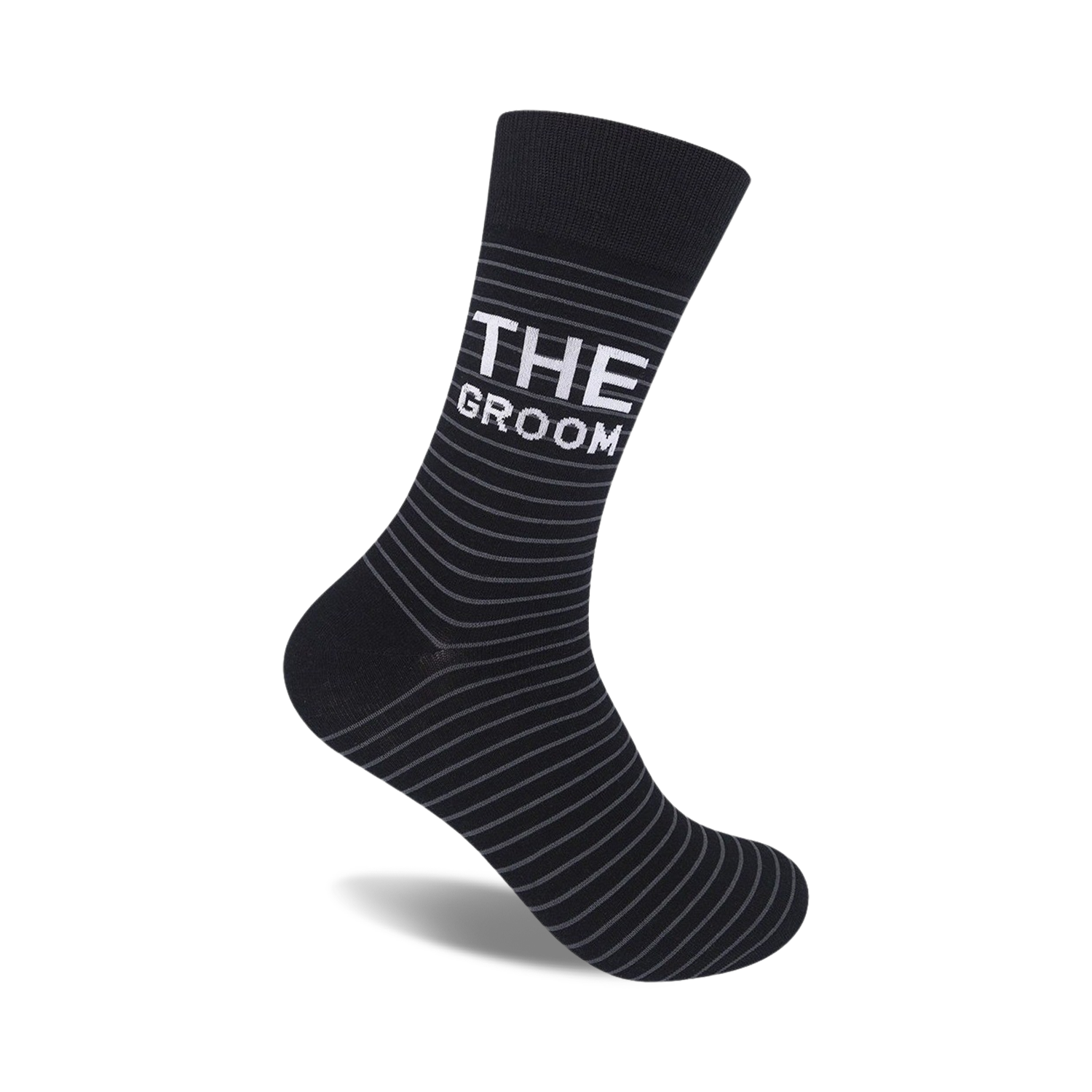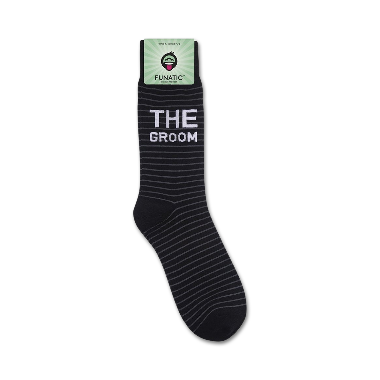 "Slip into matrimonial bliss with our dashing 'The Groom' socks! Adorned with gray stripes, these bad boys proclaim your special day status in bold white letters. Show off your individuality and commitment in style. Strut down the aisle knowing you're the GROOM with the coolest feet in town!"