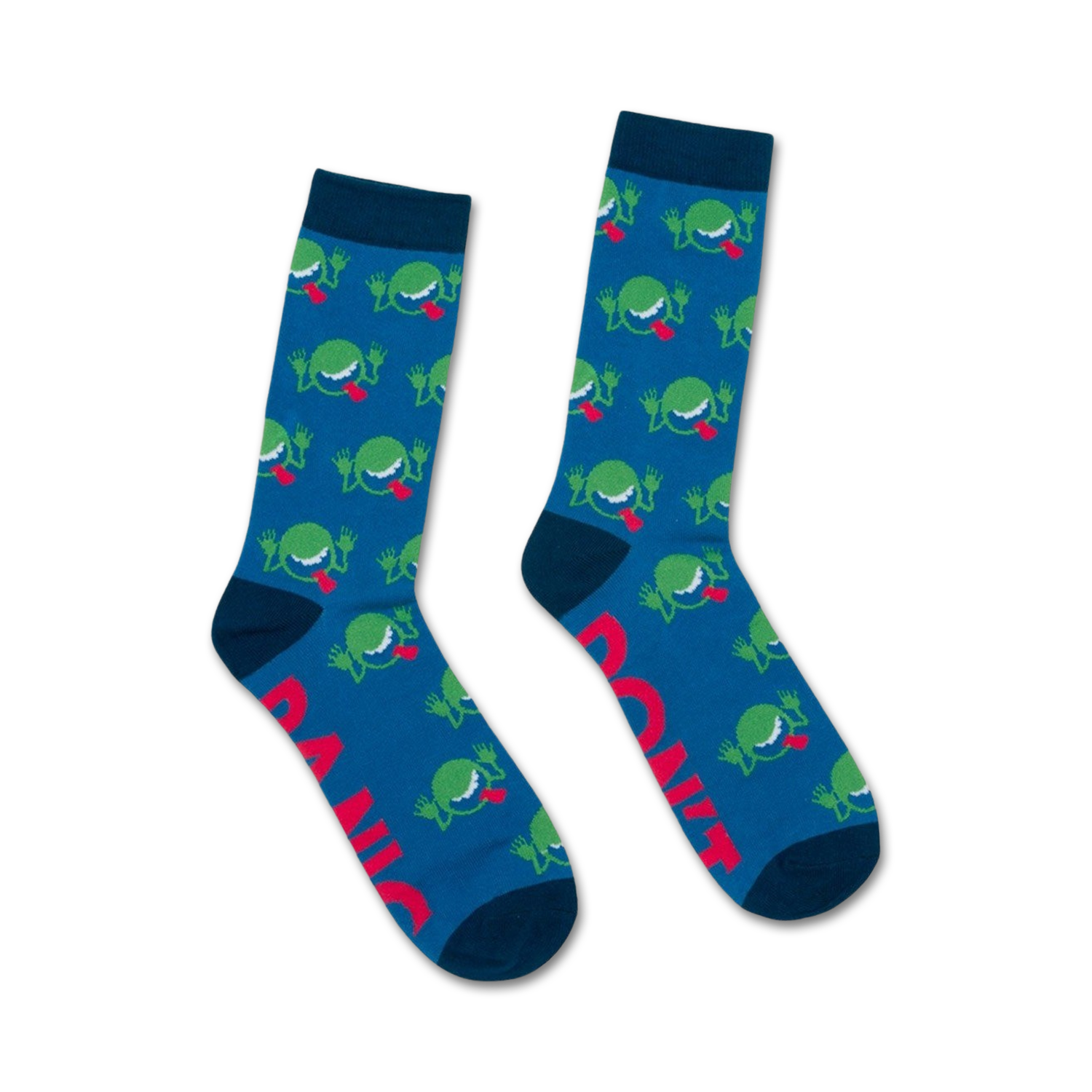 Dive into a literary odyssey with these "Hitchhiker's Guide to the Galaxy" socks. Trek across the cosmos with green cartoonish monsters as your cosmic companions, their red tongues playfully sticking out. These interstellar socks, available in blue with an all-over monster pattern, fit both men and women. Ideal for any Earthling or Vogon seeking a pop of literary flair in their sock drawer, they'll have you pondering the meaning of life, the universe, and everything, one step at a time.