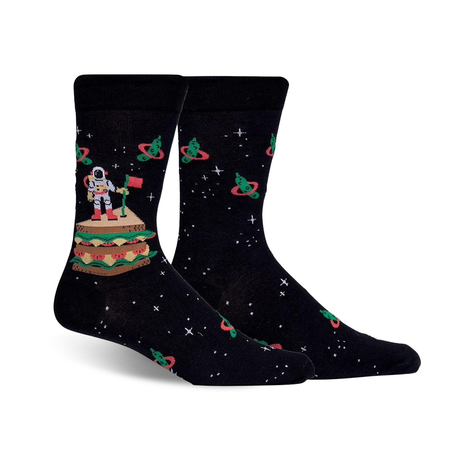 Blast off into the cosmos with these lunar-ific Moon Club socks! Featuring a starry space background and an astronaut munching on a sandwich, these socks will make you the center of the universe. They're out of this world comfortable and perfect for any space enthusiast. Just don't forget to pack them on your next trip to the moon!