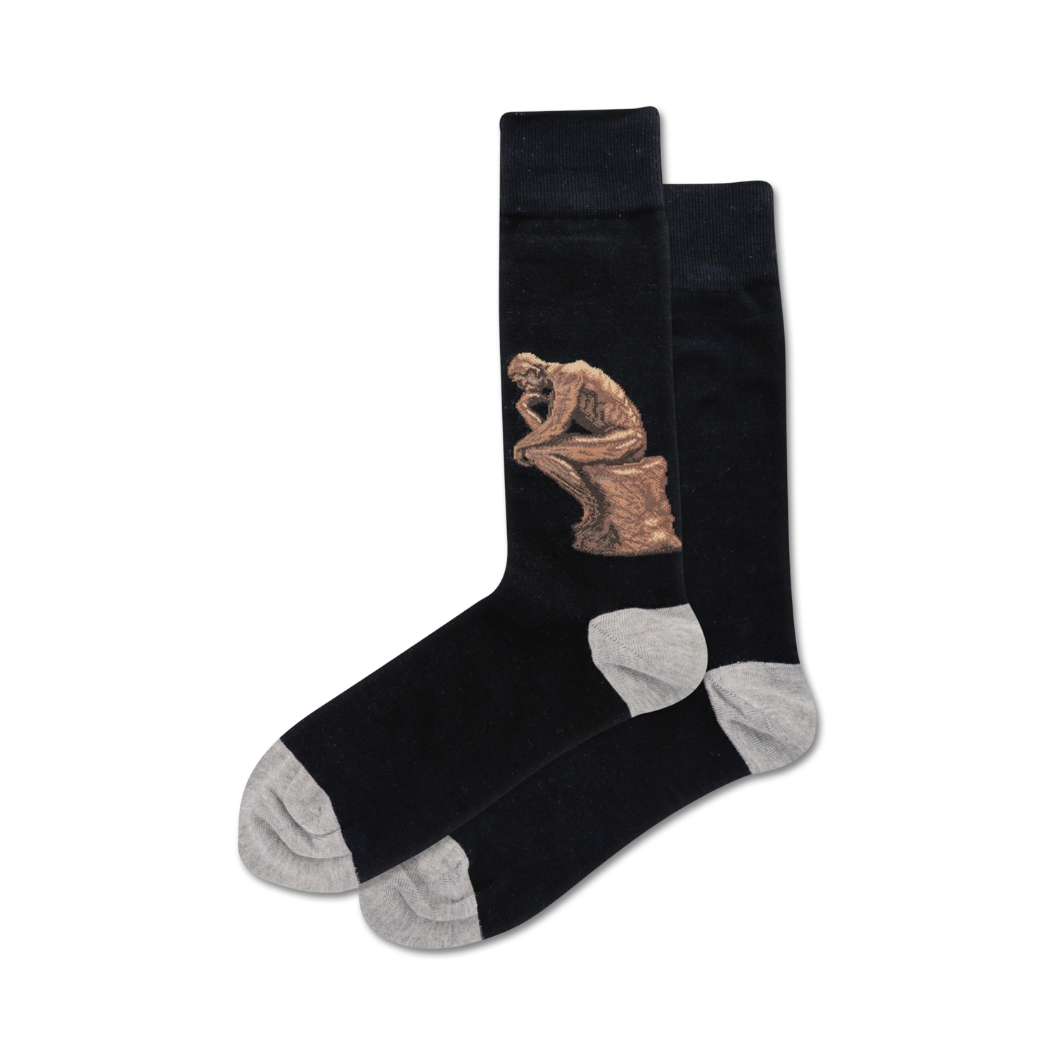 Go deep with The Thinker socks, featuring a profound pattern of Auguste Rodin's iconic sculpture. Whether pondering life's mysteries or just looking contemplative in your loafers, you'll feel smart and a tad bit artistic in these thinker socks.