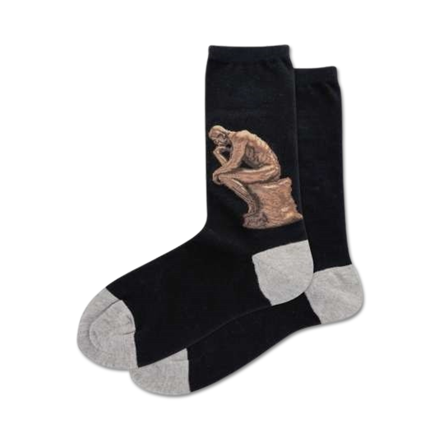 Get ready to think outside the box with our "The Thinker" socks! These black, high-quality crew socks with gray toes and heels add a touch of art and philosophy to your everyday style. The man sitting on a rock contemplating life's deep questions will inspire you to ponder your own thoughts or make others ponder yours! You'd never believe that such a classic sculpture could be depicted in socks, but you'll be glad it is!
