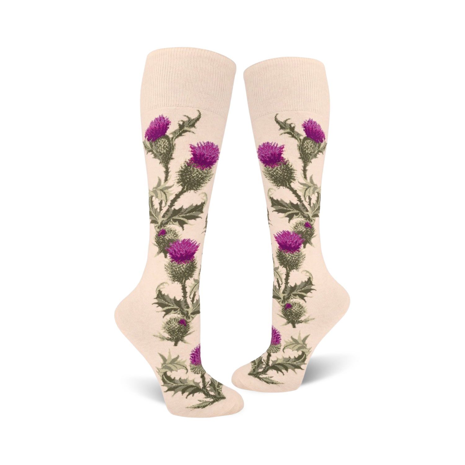 Who wears the pants in your wardrobe? These knee-high socks, of course! Thistle-mania is upon us! With our electric violet thistle pattern on a fresh white background, these socks are sure to liven up any shoe collection. They're perfect for women who want to add a pop of fun and personality to their everyday look. Even the toughest thistle can thrive through any condition. That's the energy you'll get when you step out in our Thistle socks, no matter the weather or the occasion.