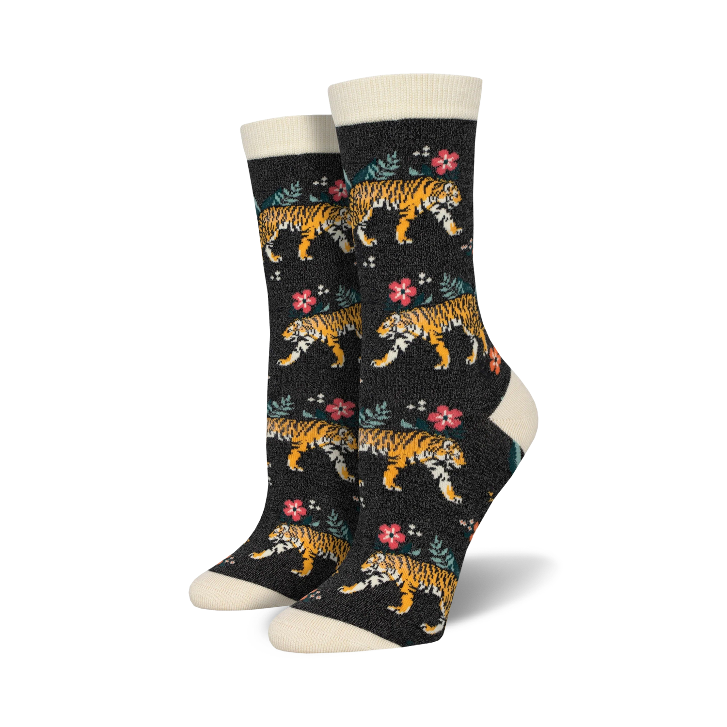 Slip into a pair of wild socks with the Tiger Floral Bamboo Crew Socks. Prowling tigers and colorful blooms set on a lush green background give these womens socks a fun, vibrant look. With their stylish design and comfortable fit, these socks will add a touch of charm to any outfit. Put on your tiger-rific socks and roar through your day!