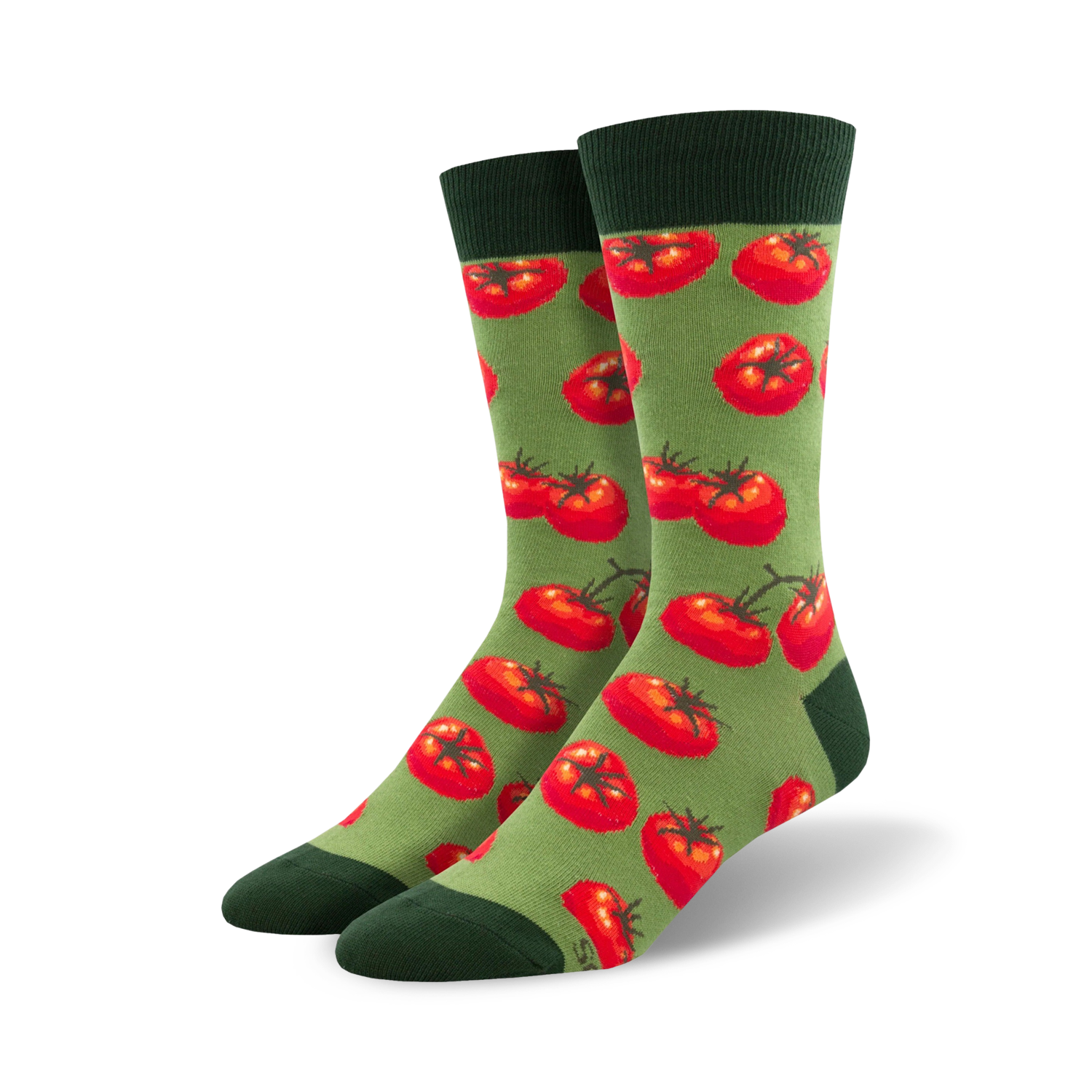 If you're tired of boring, plain socks, take a walk on the wild side with our Toe-May-Toes novelty socks! These funky crew socks for men feature a vibrant pattern of red tomatoes with yellow highlights, green stems, and light green leaves on a dark green background. Say "Yes" to fresh fashion and "No" to dull feet with our tomato-riffic socks that add a touch of whimsy and humor to your everyday wardrobe.