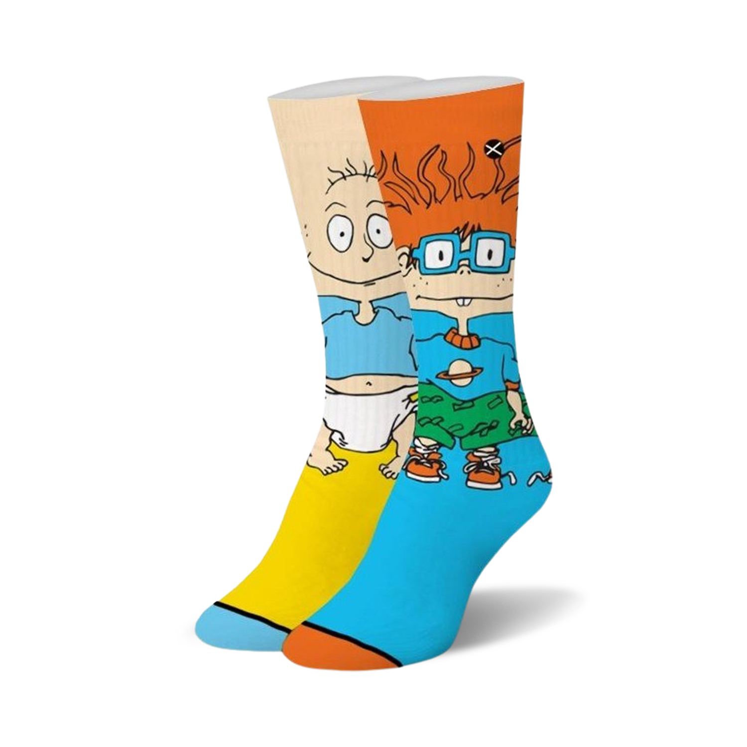 "Add some Rugrats charm to your sock collection with these crew-length beauties! The Tommy and Chuckie 360 Knit Socks feature an adorable allover print of the iconic cartoon duo. Chuckie's rocking his signature red hair, glasses, and diaper on the right sock, while Tommy brings the giggles with his blonde cowlick and diaper on the left. Get ready to make your feet the stars of the show!"