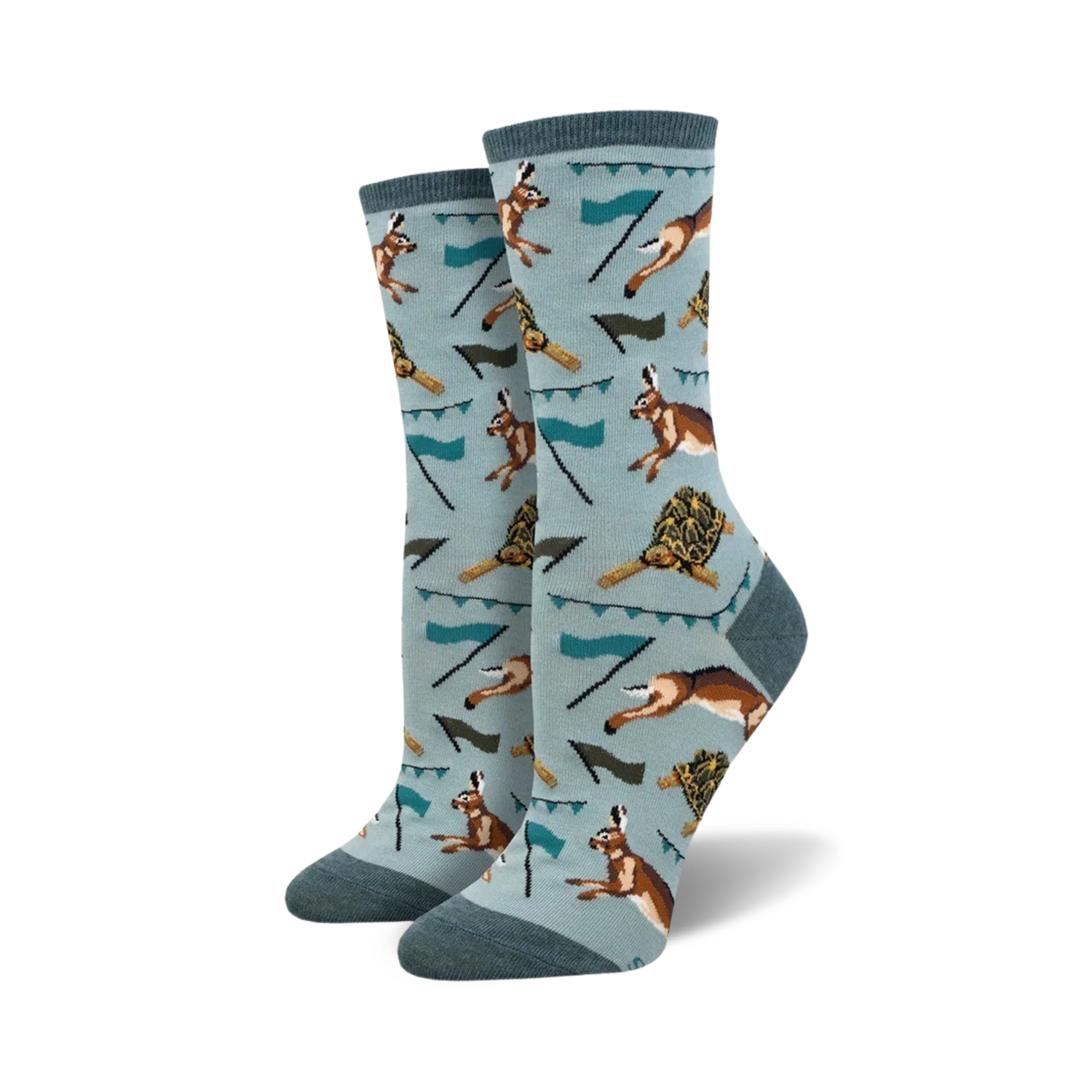 Tortoise And The Hare Womens Crew Socks: These light blue crew socks feature a pattern of happily sprinting tortoises and hares. Rock these comfy socks when you need a reminder that slow and steady wins the race.