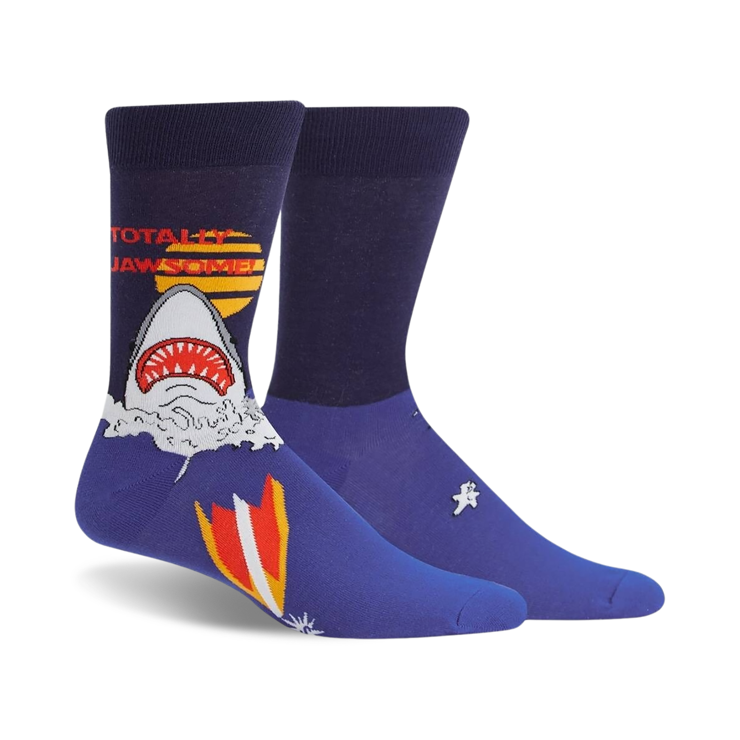 Chomp chomp! Swim into the deep blue sea in these TOTALLY JAWSOME shark socks! Bright blue waves and accents dance around an open-mouthed underwater predator. Wear these stylish crew socks for men and you'll totally rock that fin-tastic look. Fun Fact: Did you know sharks have multiple rows of teeth and can lose up to 30,000 teeth in their lifetime? That's a whole lotta chompers!