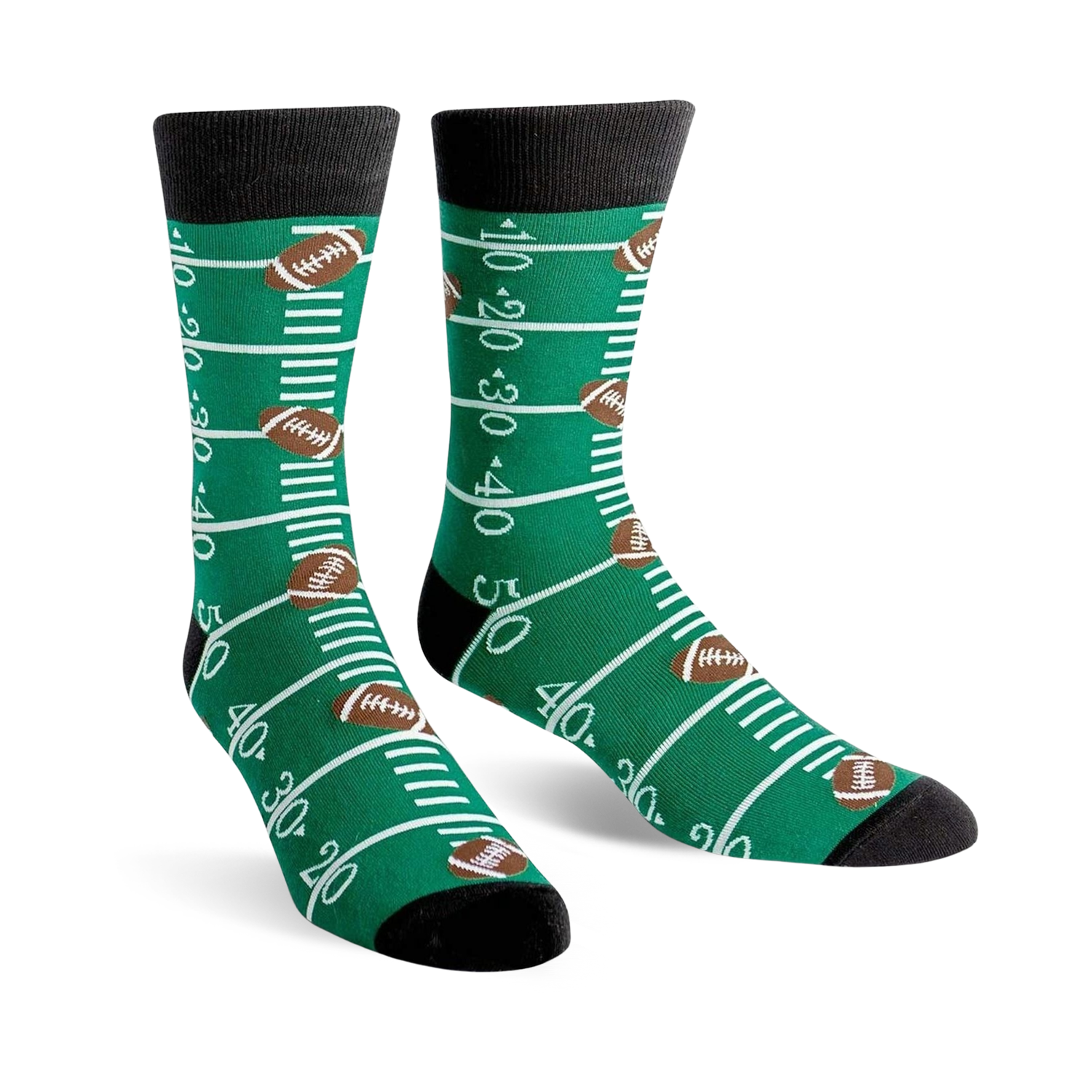 Huddle up to score touchdowns and field goals while sporting these crew-length football field-themed socks. With white yard markers and brown footballs adorning these green pigskins, these gridiron-themed socks keep your feet happy so you can keep your focus on the game.