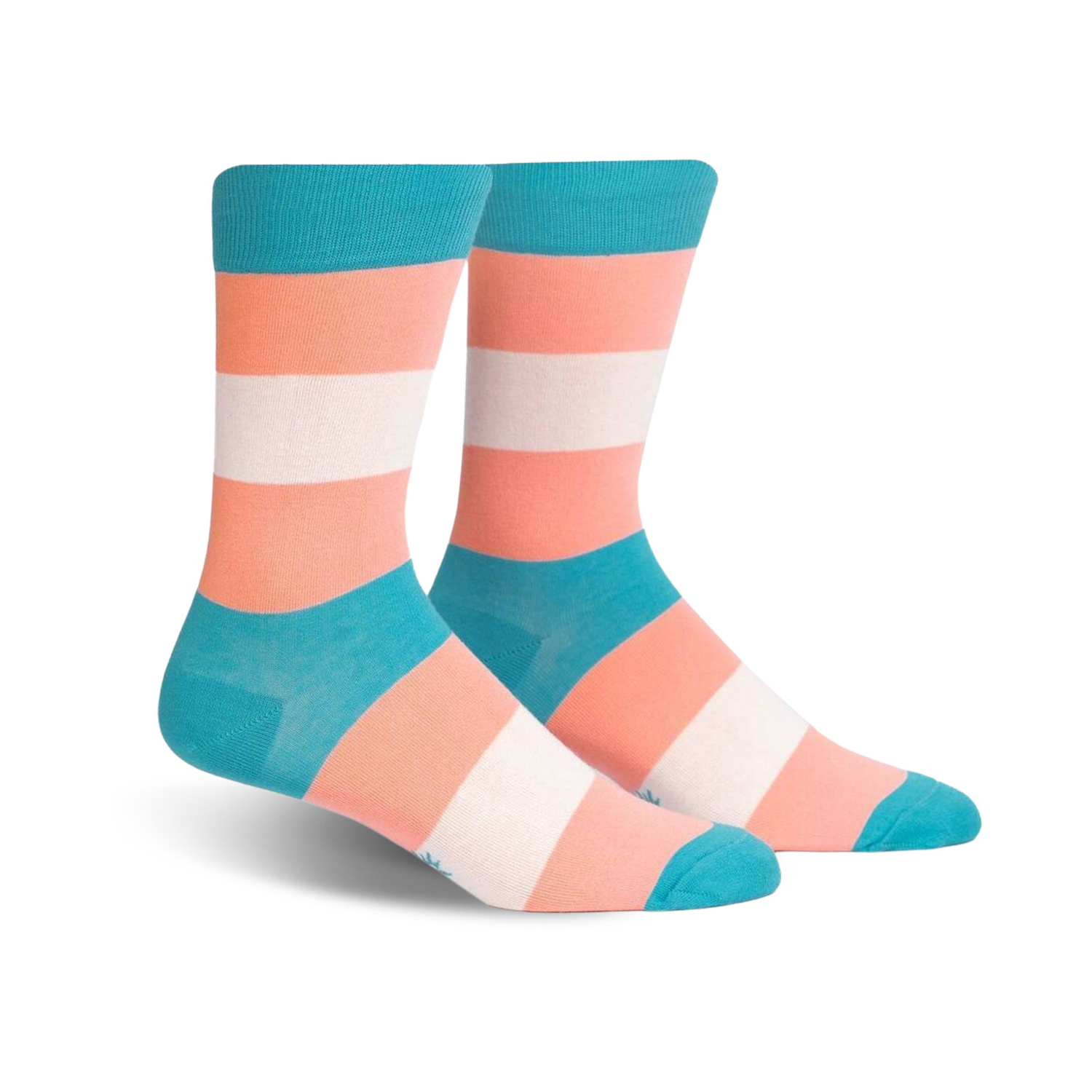 Say goodbye to boring socks and embrace the rainbows of pride with these Trans Pride striped Crew socks. These three-toned striped socks are the perfect accessory to add some color and flair to your outfit, whether you're marching in a parade or just hanging out at home. Wear your pride with these fabulous socks that will remind you that even the smallest things can make a big difference.