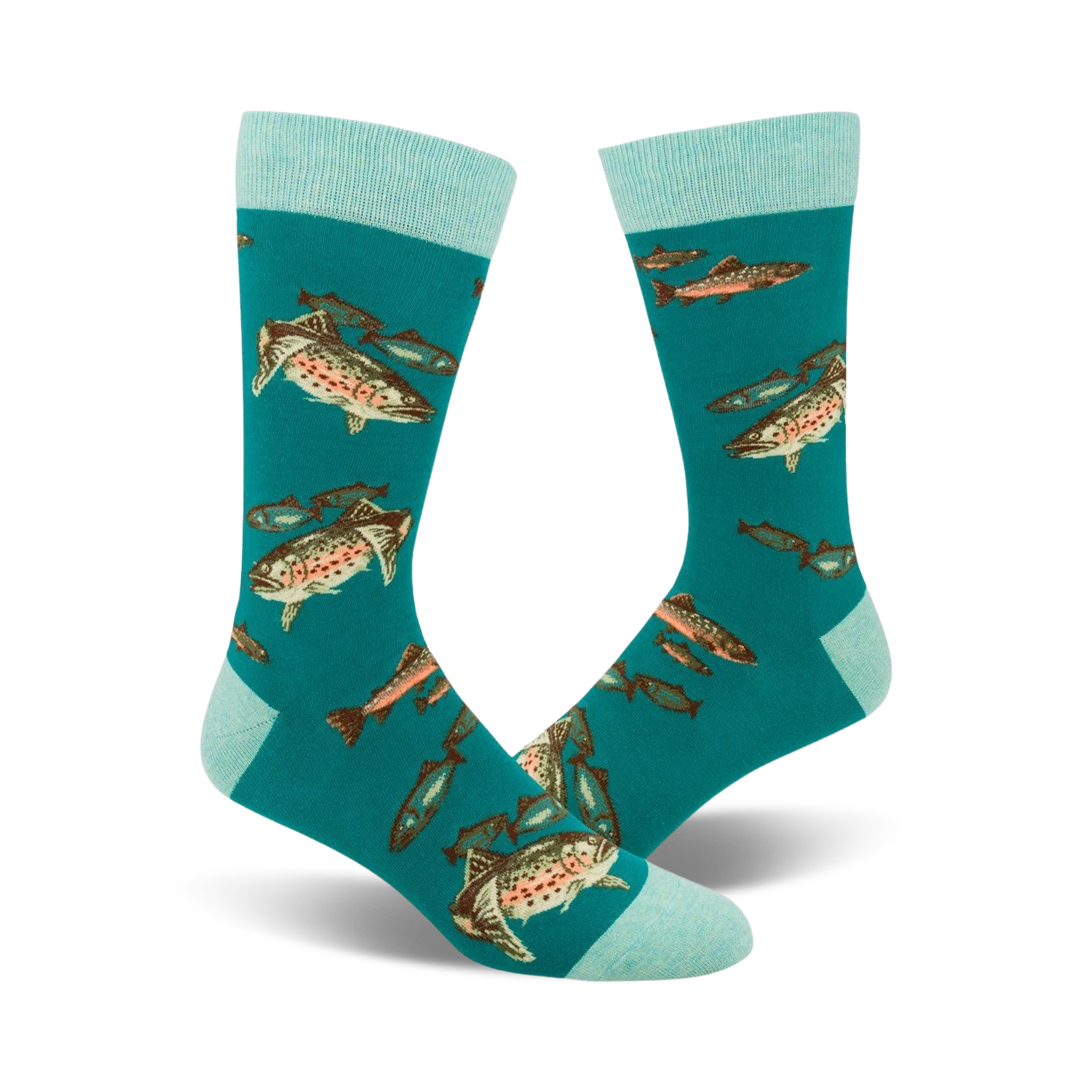 Love fishing? Here's a pair of socks that'll make you want to cast a line! Trout Fishing socks feature a cool pattern of vivid brown and orange trout swimming lively across teal blue socks. Perfect for the fisherman or fisherwoman in your life who has, well, a sense of humor! Because let's face it, these socks are as fun as a day spent on the water - no matter how many fish you catch!