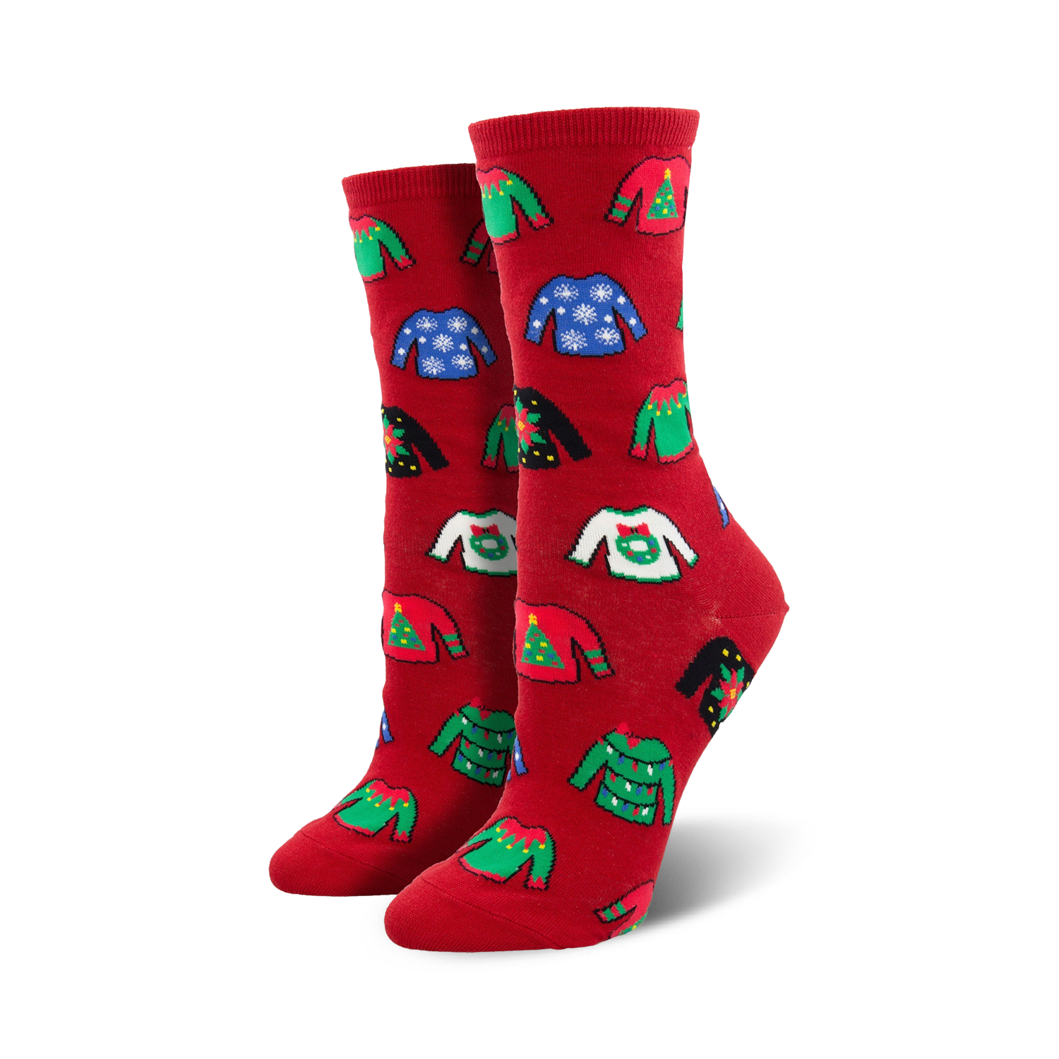 Ugly Christmas sweaters are a classic holiday tradition, but now you can keep your feet festive without the itch. Our Ugly Sweater Socks are the perfect way to show your holiday spirit from head to toe. These socks are so ugly, they're actually cute! Featuring a green background and a bright mix of sweaters adorned with Christmas trees, snowflakes, poinsettias, wreaths, and more - You will surely spread joy to all who lay eyes upon your feet this season. So, whether you're rocking them around the house or out and about, our Ugly Sweater Socks are a surefire way to get in the Christmas spirit. Plus, they make a great gift for the ugly sweater lover in your life!