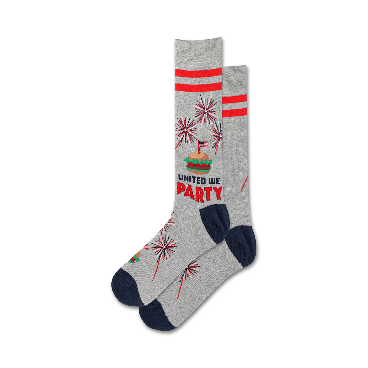 Unleash your inner patriot with these United We Party crew socks! Featuring a vibrant hamburger with an American flag and dazzling fireworks, these socks are a festive way to celebrate the 4th of July. These gray socks with red and blue striped cuffs will make you the star-spangled man of the BBQ. Plus, you'll be the coolest dude at the cookout, guaranteed.