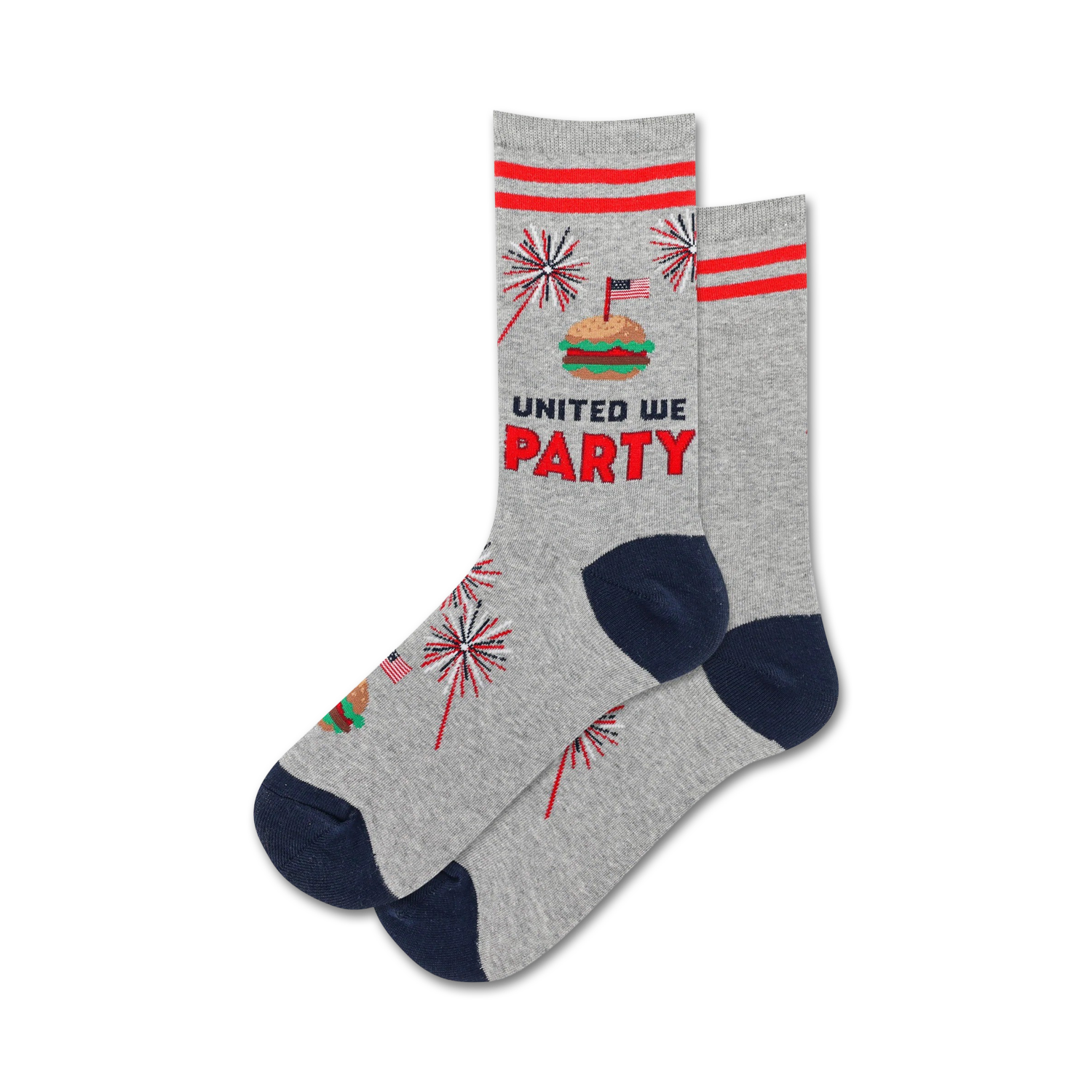 Kick off your next 4th of July BBQ in style with these United We Party crew socks! Inspired by the resilience and strength of America, our socks are adorned with gray hamburgers, hot dogs and fireworks across a crew length canvas. The words "United We Party" are written in red and blue on the socks' leg, a patriotic reminder that even the smallest efforts can make a big difference. Wear these socks to your next 4th of July cookout or fireworks show - they're sure to make a statement and start a conversation!