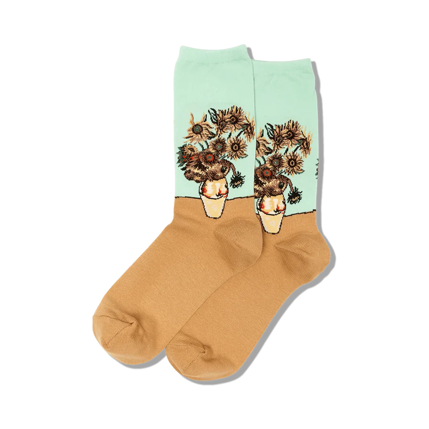 Immortalize the classic art of Vincent and wear it wherever you Gogh! This beautiful pair of blue and gray socks feature the iconic vase of sunflowers in one of Van Gogh's most famous artwork pieces. Not only are sunflowers featured in the famous painting but they also symbolize gratitude, adoration, loyalty and longevity. Long live art and long live your cool Van Gogh socks!