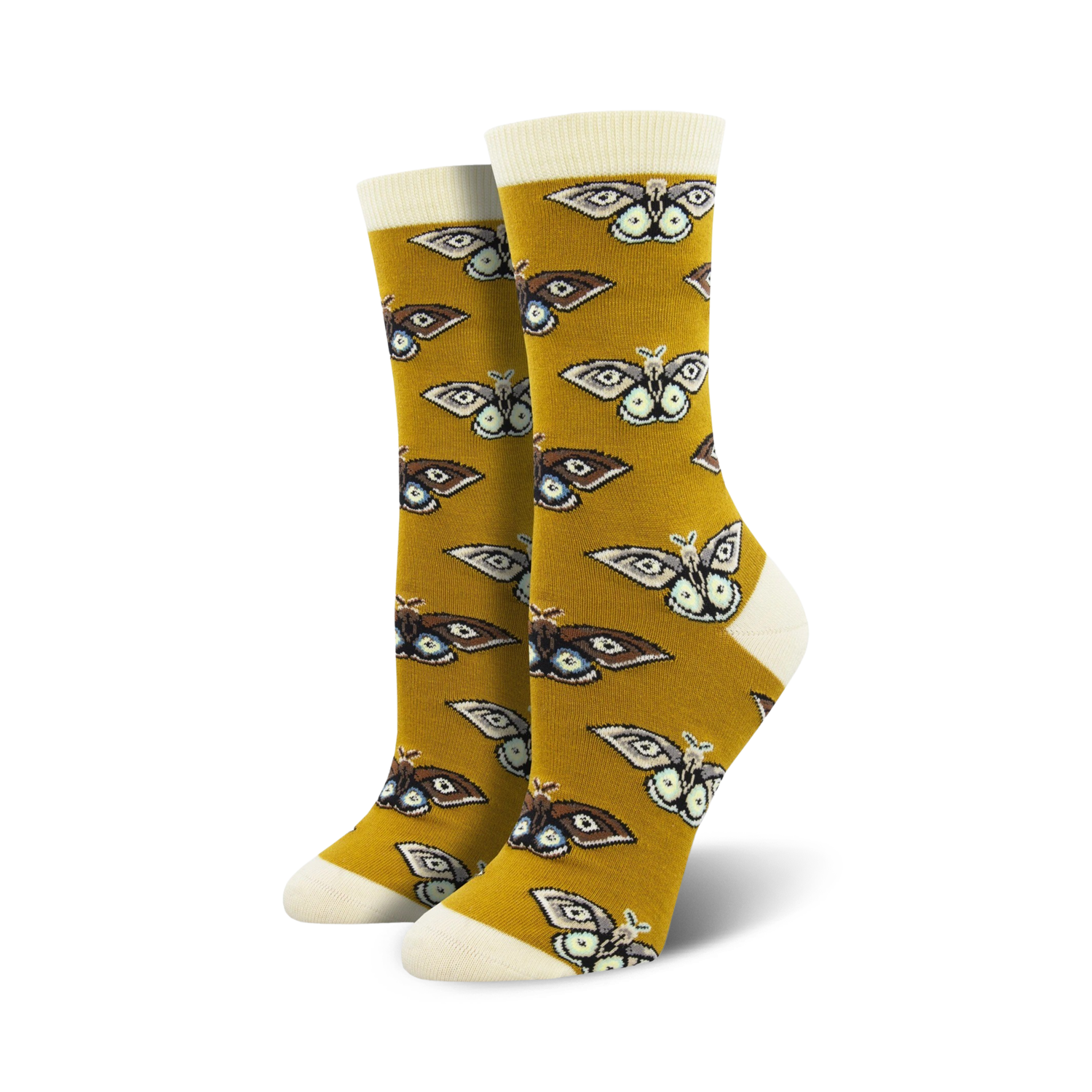 Vintage Moths Bamboo Crew Socks: Fall into fashion with these fun and fl-utter-ing socks! These yellow and blue moth print socks bring the world of moths to life, wrapping your feet in nature's retro design. Embrace your wild side and let these socks be a reminder that beauty can be found in the unlikeliest of places. Plus, these socks are as soft as a moth's wing, so you'll feel like you're walking on a cloud. Moth-er of pearl, these socks are moth approved!