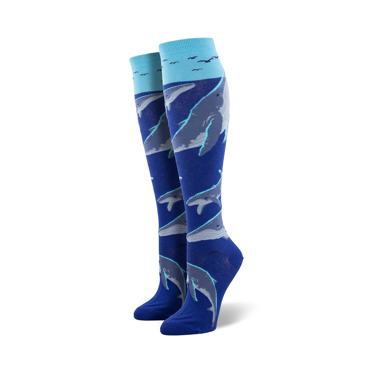 Dive into the deep blue with these Whale Watching knee-high socks for women! Picture this: a clear blue ocean with cartoon whales swimming about, topped off with light blue waves. These fun and funky socks are sure to make a splash wherever you go. Get ready to ride the waves of fashion and embrace your inner whale enthusiast. Let's make waves and stand out from the school!