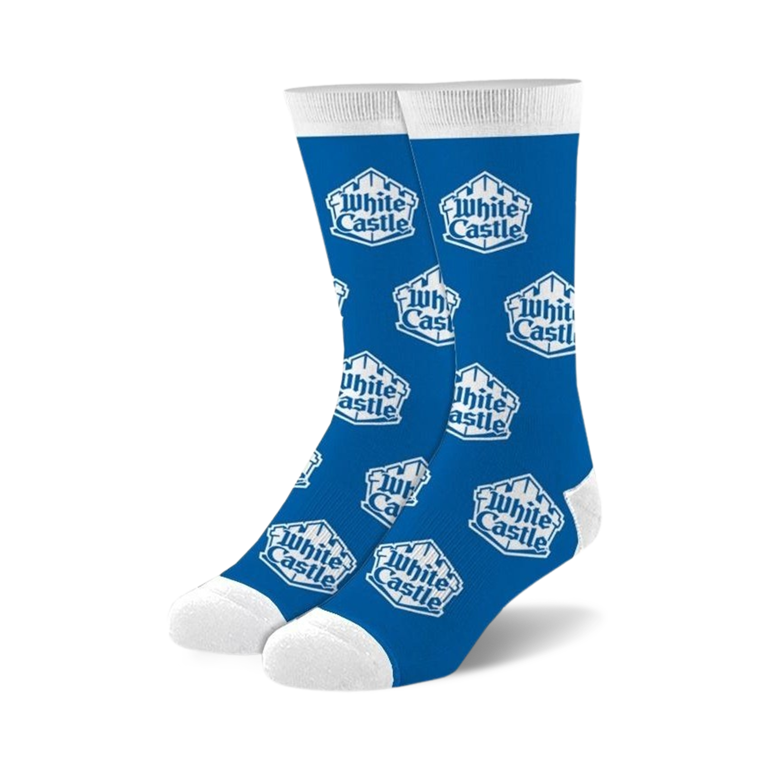 Get your order of fun in these sky blue socks covered in the White Castle logo! These tasty kicks are sure to satisfy your craving for a little something extra.