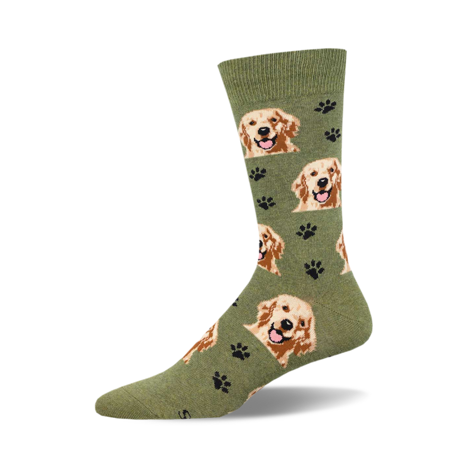 Show some love for the 'goodest boys' with these comfortable olive green crew socks. They're covered in a happy pattern of Golden Retriever faces, each one looking cheerful with a little pink tongue peeking out. Black paw prints are scattered all over the visible parts of the sock, as if your best buddy just walked by. These socks offer a simple, laid-back way to celebrate your favorite furry friends. A great pick for dog lovers and anyone who appreciates easygoing style.