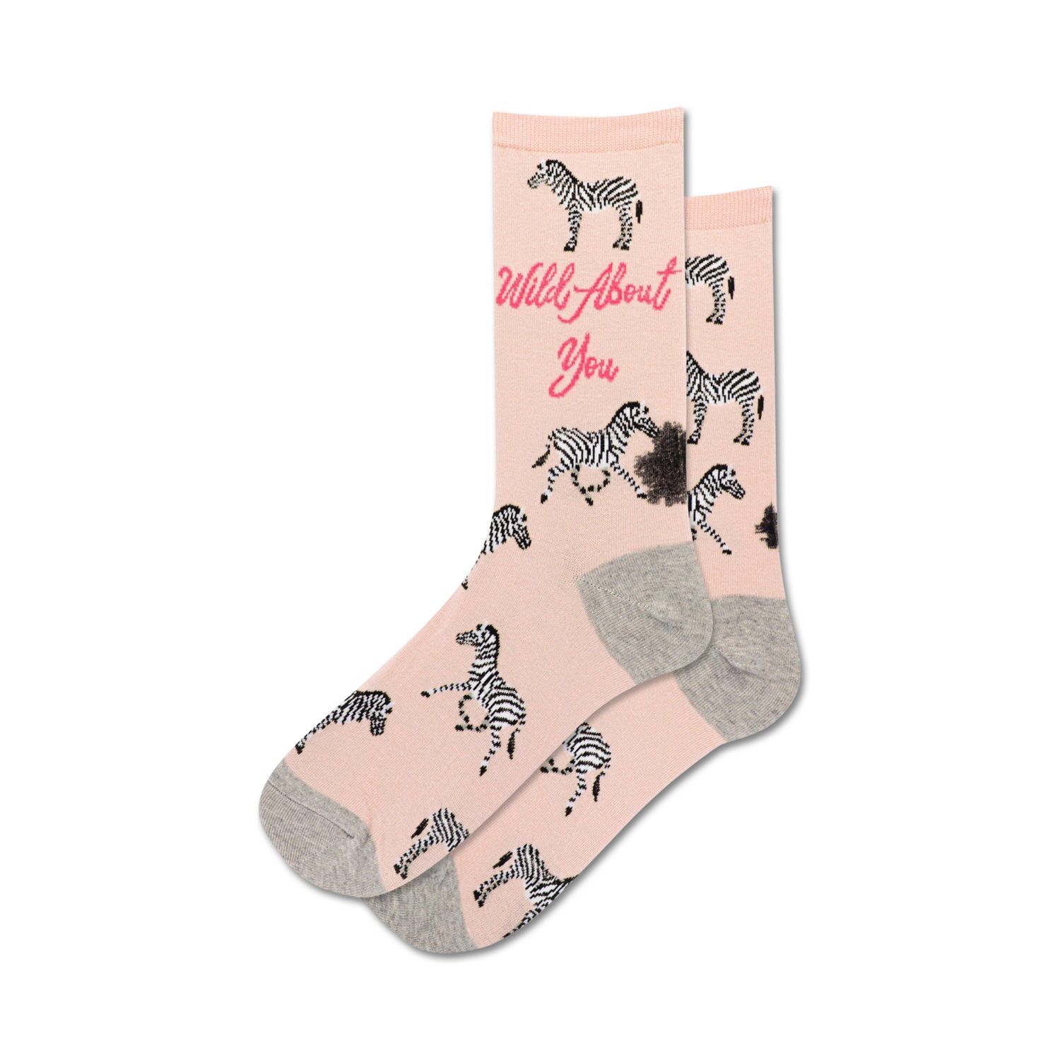 Get ready to go wild and let your feet lead the way in the "Wild About You" zebra socks! These crew-length, pink socks feature a striking pattern of fierce black and white zebras. With their playful "Wild About You" slogan, these socks are perfect for the playful fashionista with a zest for life. Slip on a pair of these and dare to stand out, whether you're roaming the urban jungle or conquering your personal savannah. These socks are the ultimate symbol of resilience and style. So, get wild and embrace your inner zebra today!