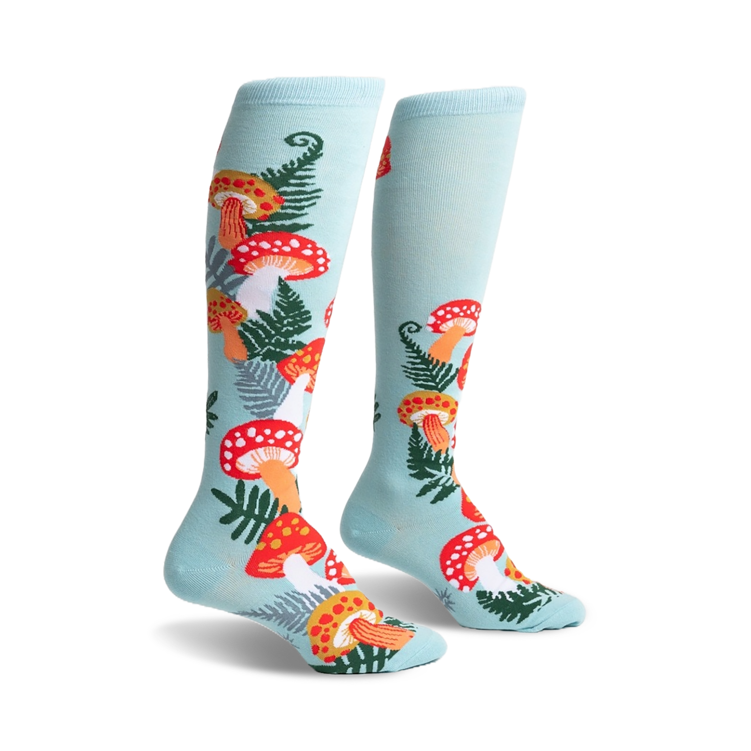 Journey into a whimsical wonderland with our enchanting, knee-high Mushroom socks! Picture a mesmerizing light blue canvas dotted with vibrant red and orange mushrooms adorned with playful white spots, alongside flourishing green ferns. Slip into a world of magic and delight with each step, letting the whimsical design transport you to a realm of endless imagination and joy. Embrace the wonders of this delightful accessory and let your feet embark on an adventure like no other!