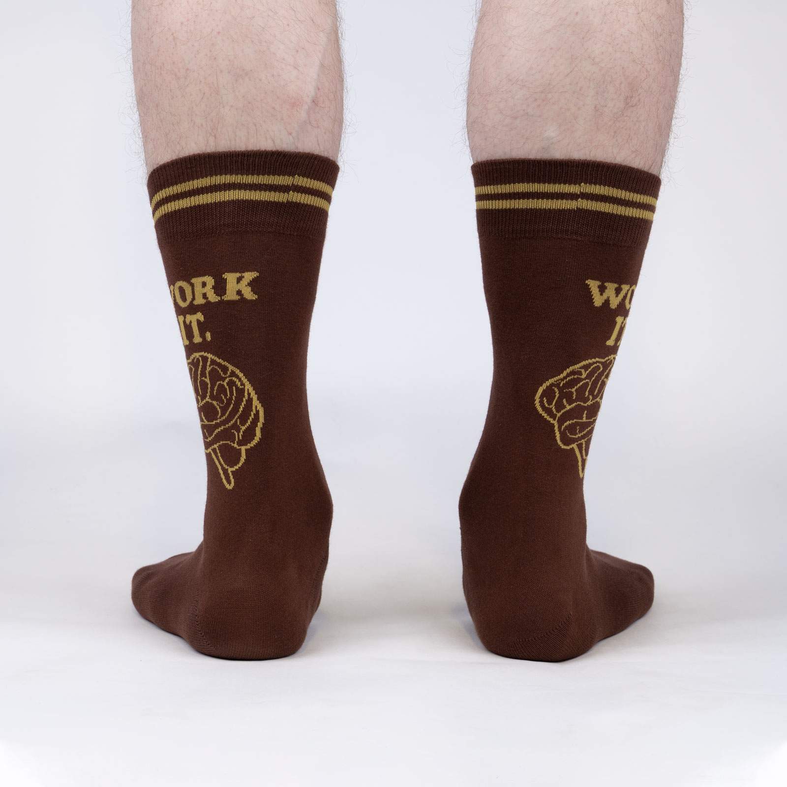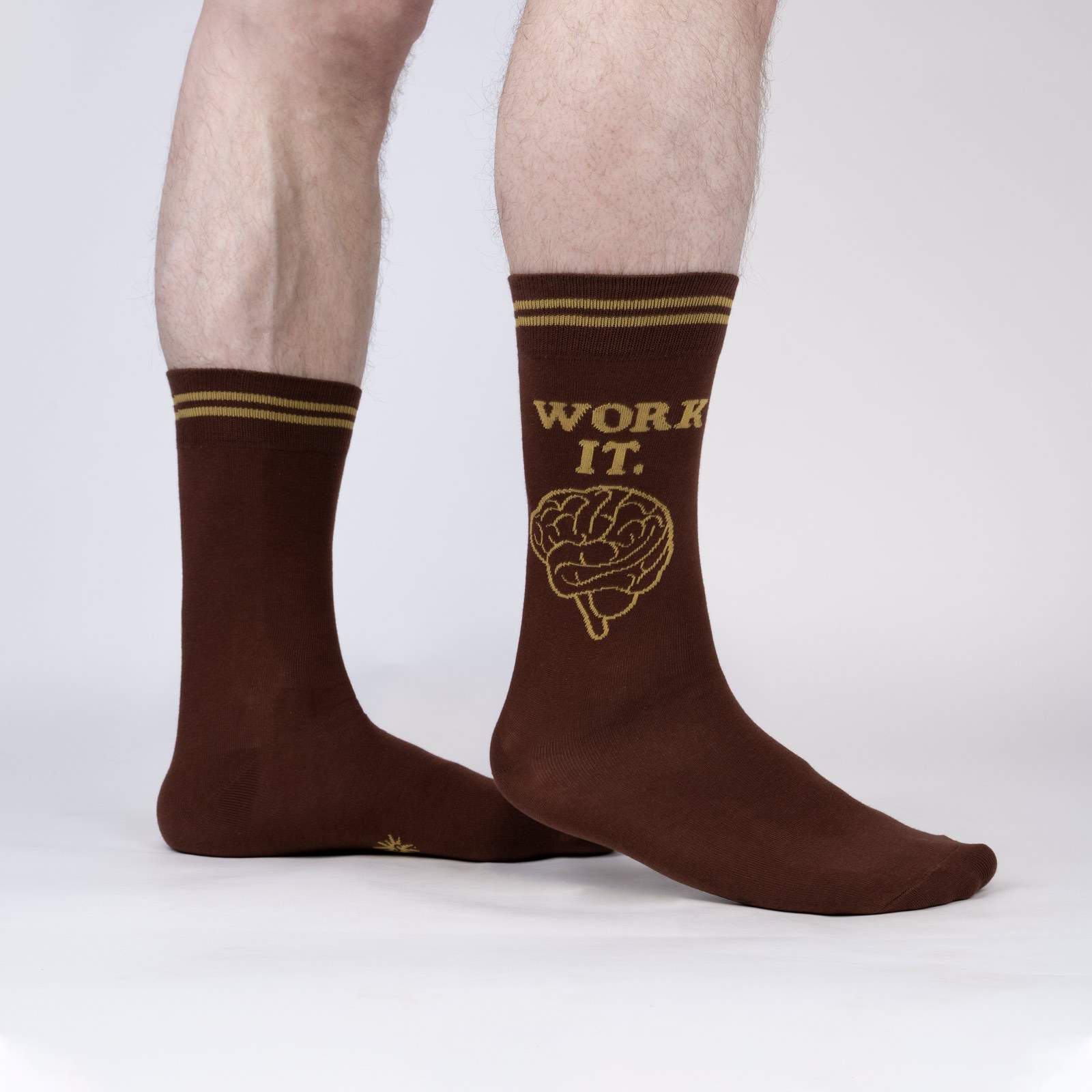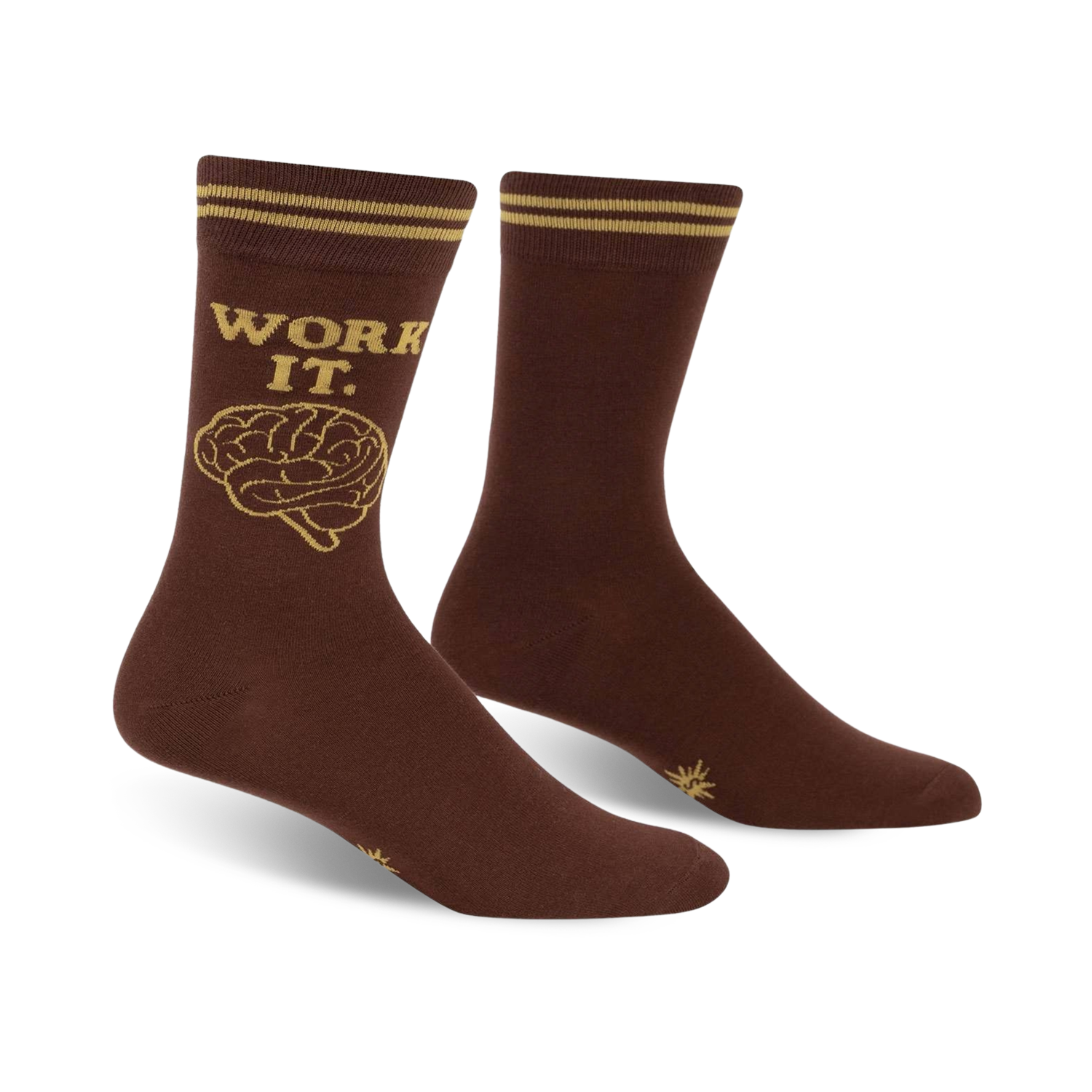 Raise the roof with our 'Work It' socks! These brown socks, with their bold gold letters and gold toe and heel, are guaranteed to grab attention. Put a pair of these crew-length socks on and get ready to strut your stuff. Ideal for men who appreciate a touch of geeky style. Who knows, you might even find yourself chanting "work, work, work it" as you walk down the street!