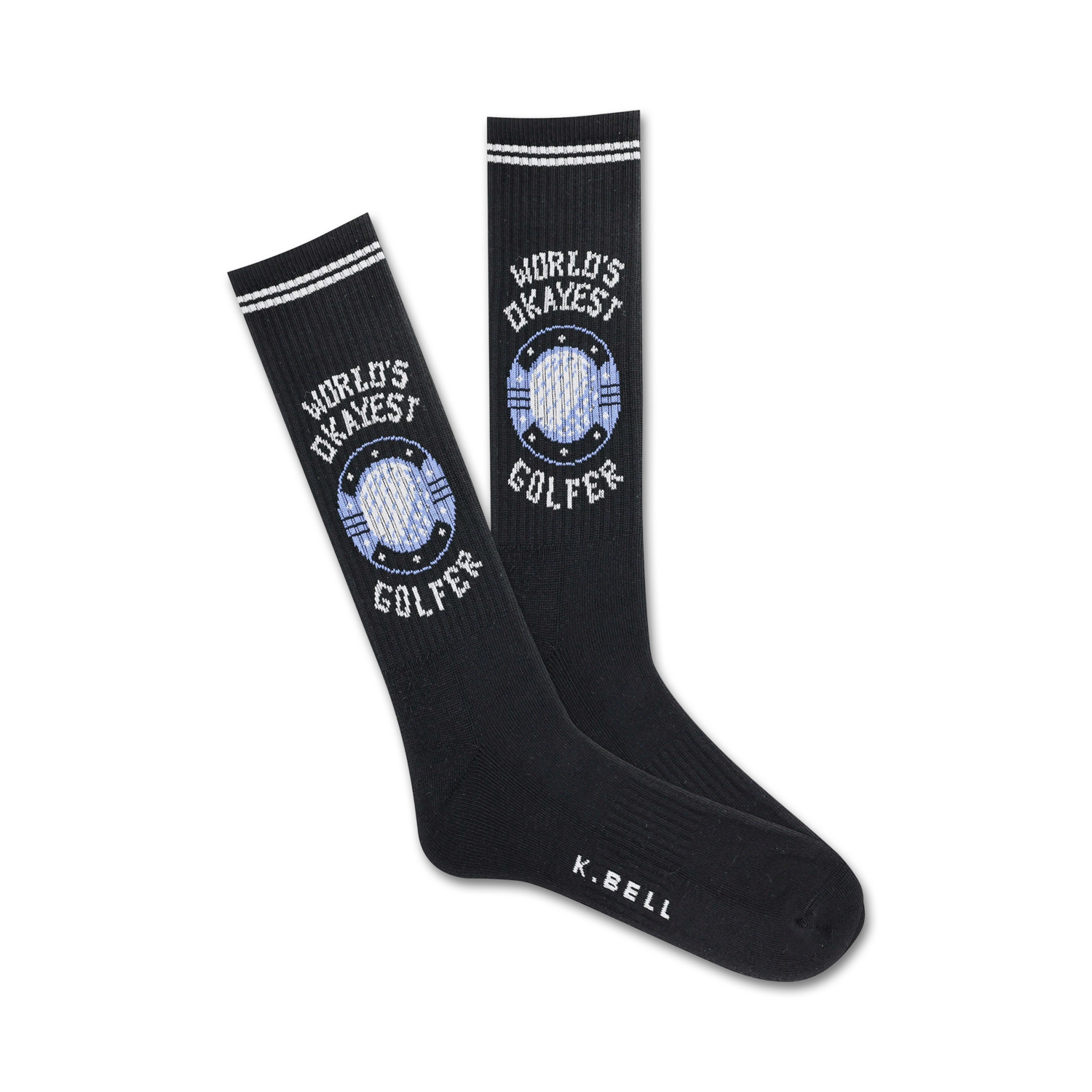 In the world of golf, where precision and perfection are often the holy grail, we present you with a pair of socks that dare to embrace the beauty of imperfection. Meet the World's Okayest Golfer socks, a celebration of those who hit the ball as much as they find it, and who cherish every slice, hook, and duff as a testament to their unwavering love for the game. Crafted with a blend of comfort and humor, these black crew socks are playfully adorned with the words "World's Okayest Golfer." So, the next time you're teeing off, whether you're a seasoned pro or a total newbie, slip into a pair of these socks and let your swing - and your sense of humor - do the talking. And who knows, you might just surprise yourself with a hole-in-one. And remember, even the world's okayest golfer can have a great time on the golf course.
