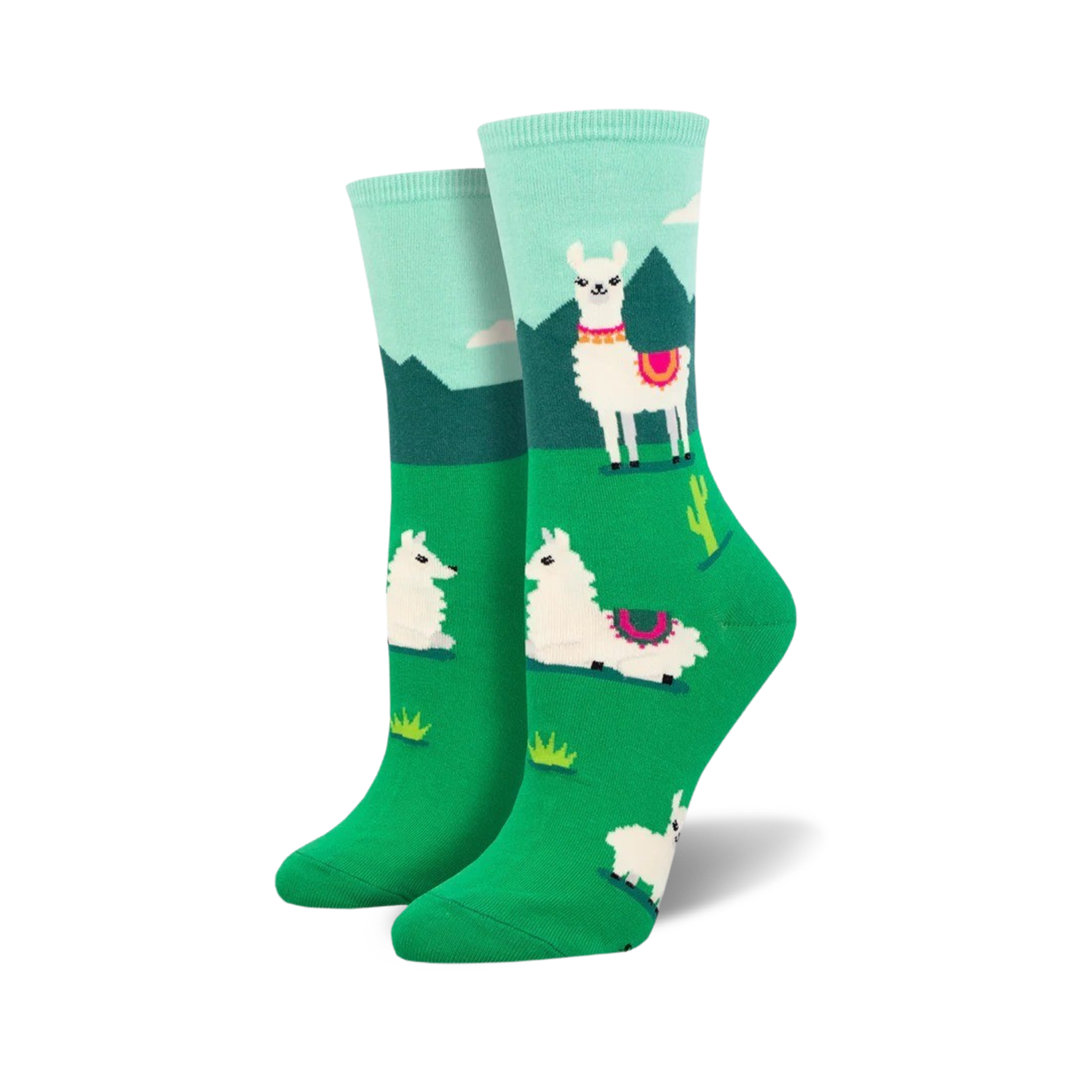 Yo, llama lovers! Get ready to hoof it in these super cute and comfy llama socks! With their white coats, pink and black details, and adorable faces, these llamas are sure to make you smile. They're standing tall in a green field with cactii and mountains in the background, reminding you that even the smallest creatures can be incredibly resilient. Show off your llama love and spread happiness wherever you go!