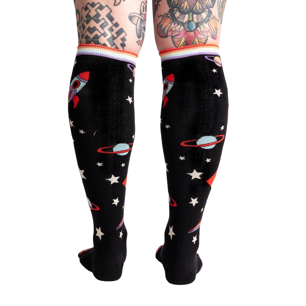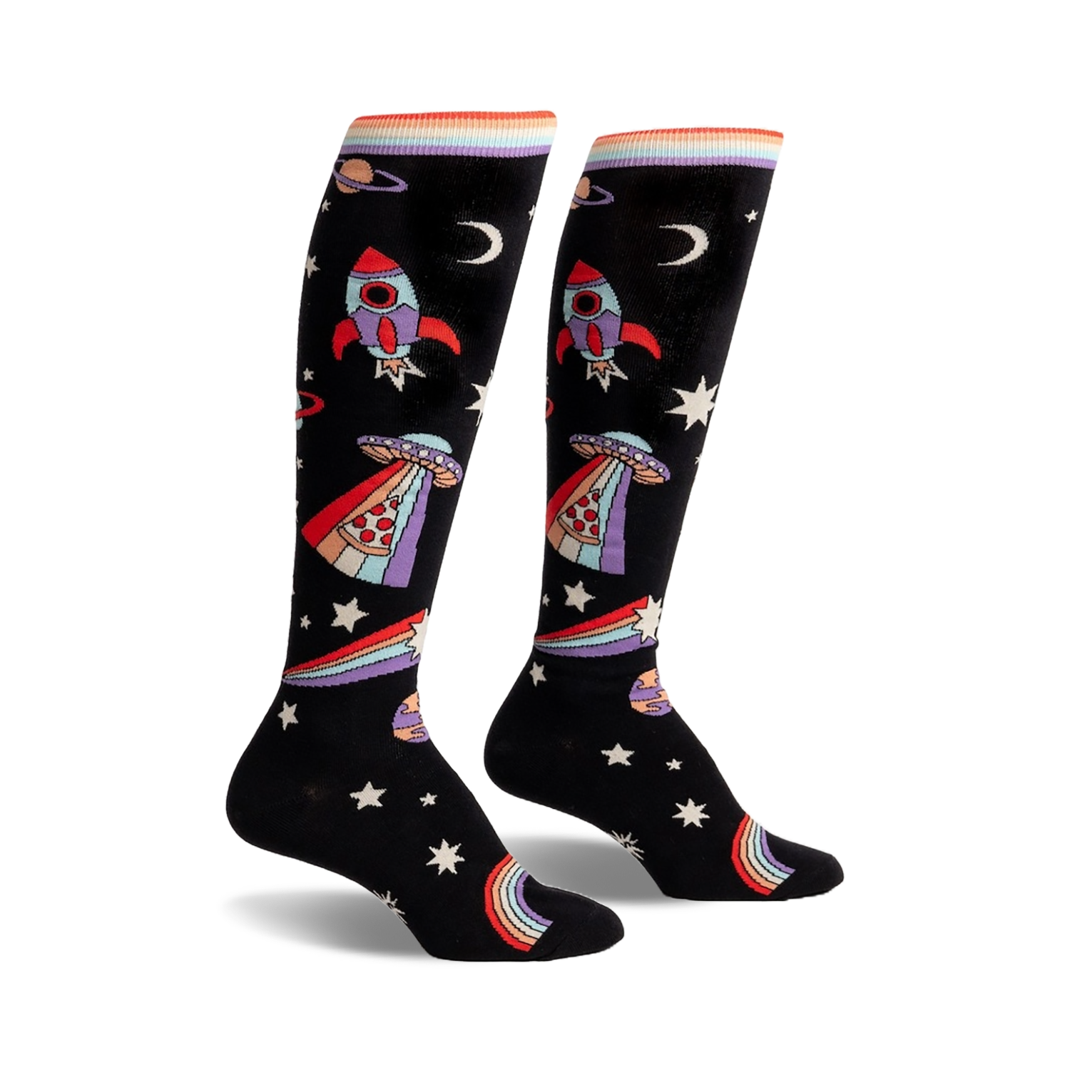 Blast off in style with these You Are Outta This World knee-high socks! The stellar black backdrop features colorful rockets, UFOs, moons, stars, planets, pizza, and rainbows. Like an astronaut on a daring mission, these socks will help you explore the universe of fashion. So, grab a pair of these space-tacular socks and let your feet take the cosmic stage!