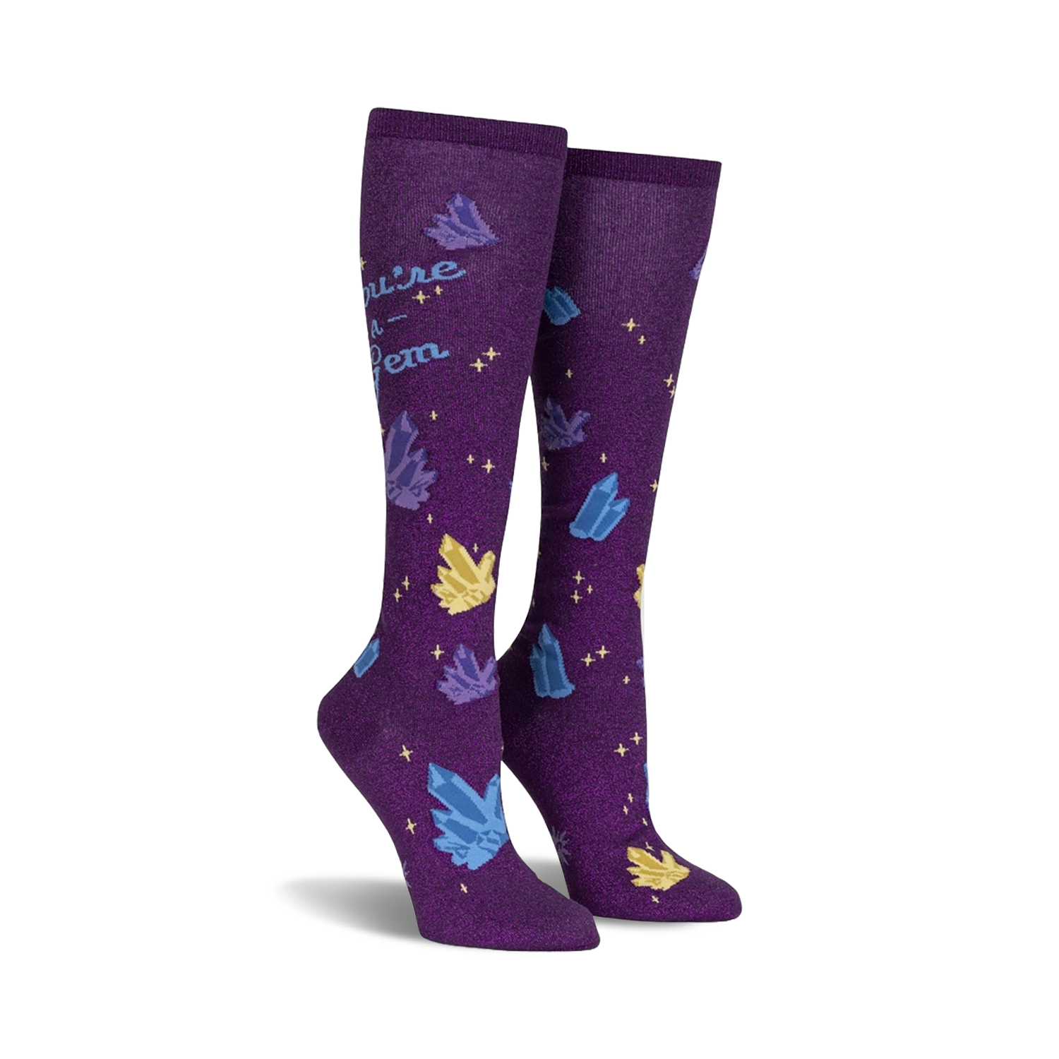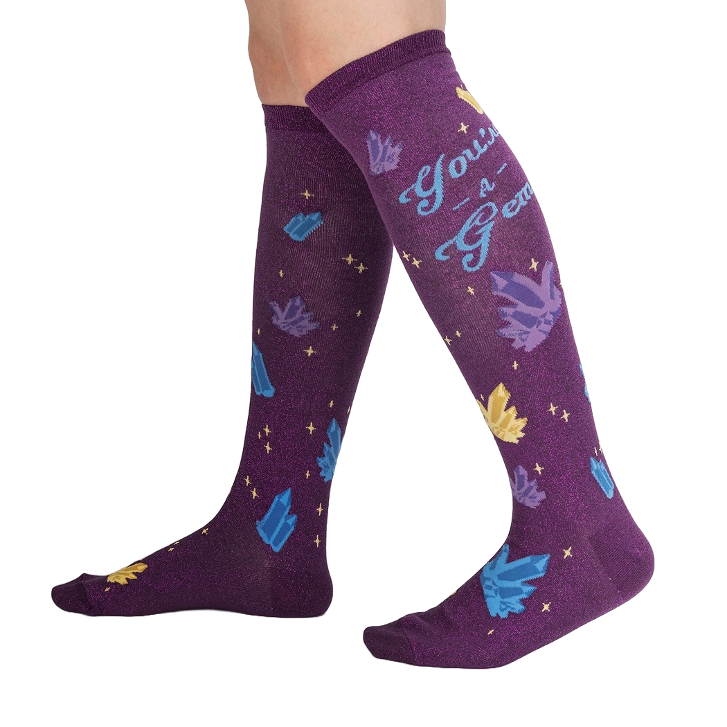 You're a Gem socks: Who says gems can't be comfy? Rock these stunning purple knee-highs adorned with a pattern of precious jewels and own your sparkle. Perfect for the gem-thusiast who loves to add a dash of glam to their everyday attire.